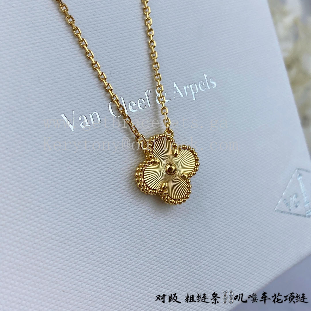 La Réplique du pendentif Van Cleef Alhambra est un chef-d’œuvre artisanal, mettant en valeur le motif emblématique de l’Alhambra dans un superbe motif guilloché. Fabriqué à partir d’une combinaison d’or jaune, d’or rose et d’or blanc, ce pendentif respire l’élégance et la sophistication. Le design complexe présente une série de feuilles de trèfle interconnectées, symbolisant la bonne fortune et la prospérité. Le pendentif est suspendu à une chaîne délicate, lui permettant de pendre élégamment autour du cou.