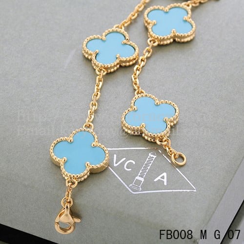 Ce magnifique bracelet Van Cleef&Arpels Vintage Alhambra présente cinq motifs en or jaune 18 carats, ornés de nacre turquoise et de détails complexes. Le design emblématique de l’Alhambra est une classe de maître en matière d’élégance, chaque motif présentant un délicat motif de fleurs et de feuillages. La nacre turquoise ajoute une touche de fantaisie et de sophistication, tandis que l’or jaune offre un contraste chaleureux et luxueux.